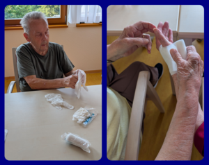 Das haben wir zum Anlass genommen, über das Thema Erste Hilfe zu reden und auch ganz praktisch zu üben. Wir waren erstaunt, wie viel unsere Tagespflegegäste noch zur ersten Hilfe wussten, z.B. Herz-Druck-Massage und stabile Seitenlage. Zudem zeigten sie sehr viel Gebeim Anlegen von Verbänden.