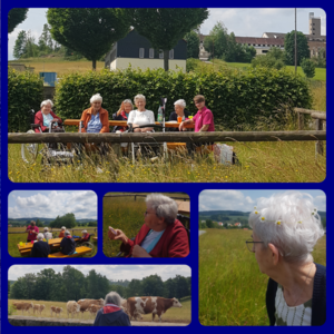 Das sommerliche Wetter war herrlich. Am Dorfleben konnten wir alle miteinander teilhaben: die Kühe kamen vorbei, bunte Feldblumen standen in üppiger Pracht und ein Traktor ließ nicht lange auf sich warten. Zur Krönung wurde ein Gänseblümchenkranz geflochten und aufgesetzt.