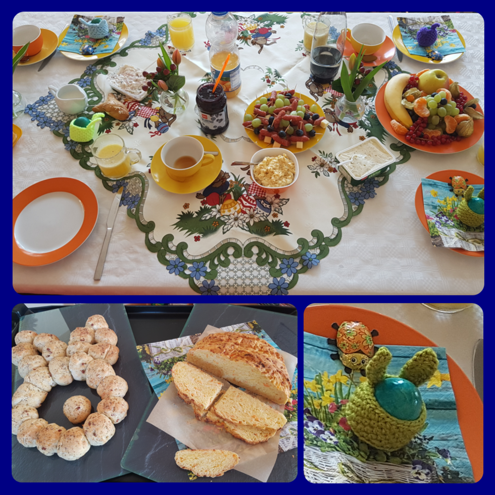 Wir deckten den Tisch mit selbst gefärbten Ostereiern in liebevoll gehäkelten Häschen, selbstgemachtes Osterbrot, Eiersalat, reichhaltige Wurst- und Käseplatten, Marmelade und vielem mehr. Kein Wunsch sollte außer Acht bleiben. Es war ein toller Tag mit vielen zufriedenen Gesichtern.