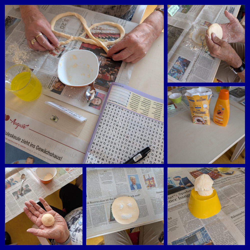 Um herauszufinden warum unsere Enkel und Urenkel so verrückt nach Schleim und dergleichen sind, haben wir uns kurzerhand entschlossen selbst etwas ähnliches herzustellen. Aus Speisestärke und Shampoo kneteten wir uns einen »Schleim« zurecht. Je nach Mischverhältnis war dieser gut formbar. Durch das Kneten und Gestalten trainierten wir unsere Fingerfertigkeiten.